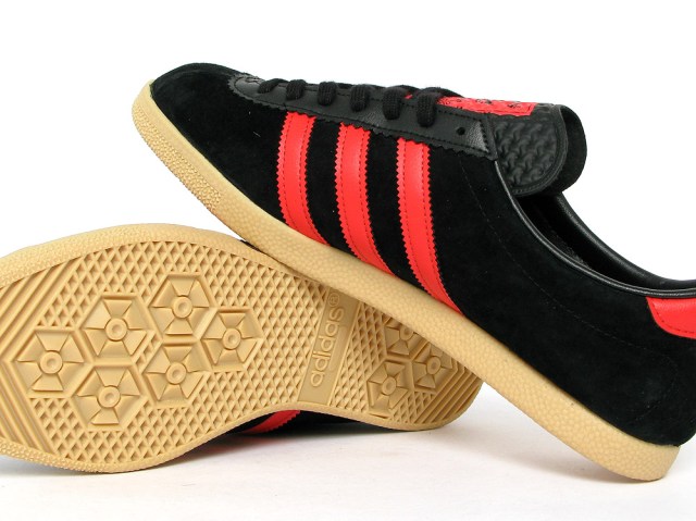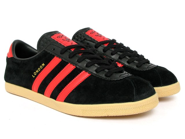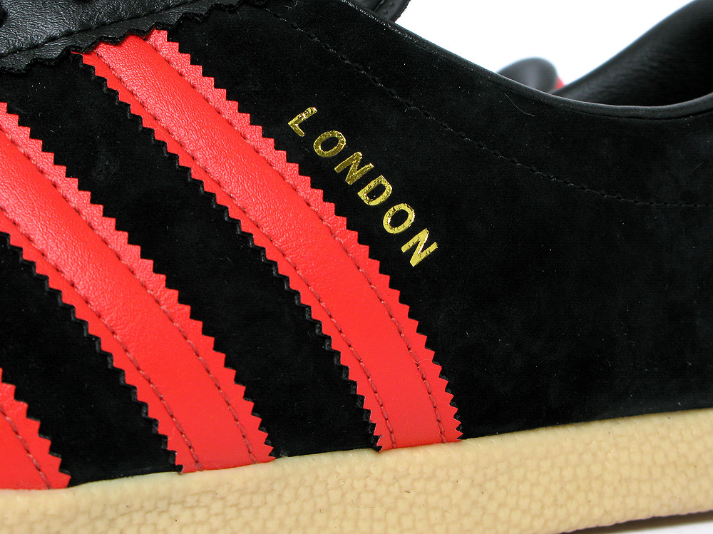 “The shoe features a black suede base, with dark orange hits on the Three Stripes, tongue and heel tab. Black leather works the inner liner and eyestay, while gum finishes up the sole.”