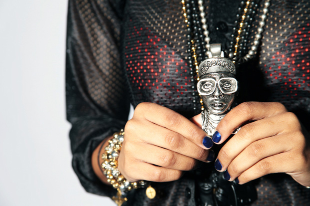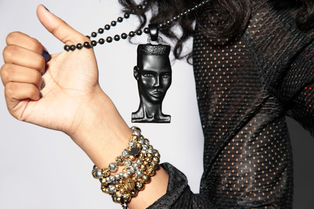 “The unique jewelry includes some black, silver and some gold pendants of famed photog Terry Richardson, model/actress Grace Jones, Spike Lee as Mars Blackmon, musicians Michael Jackson and Lady GaGa and designer Karl Lagerfeld who even wears the silver version of his medallion.”