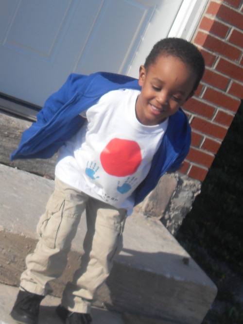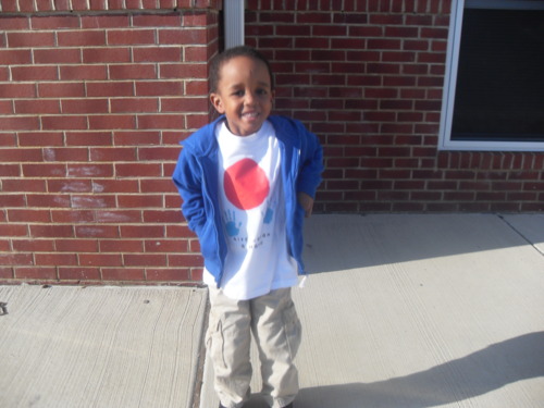 After several conversations about ways to help and what helping means we thought it would be great if he did a t shirt and teddy bear line. While finger painting HE created what would be the “Jaé Helps Japan” design, his interpretation of the Japanese flag with his hands reaching out to offer help.