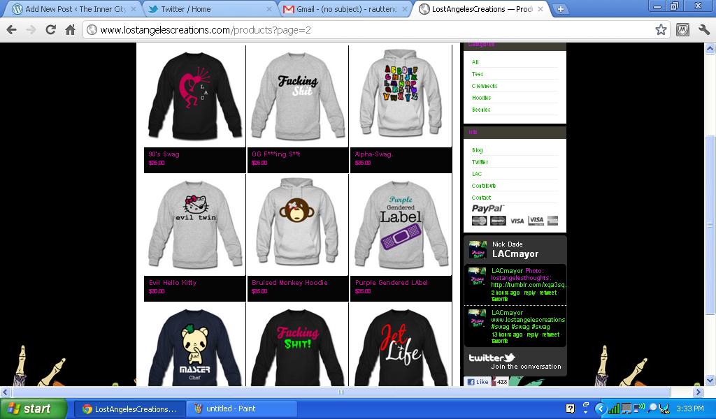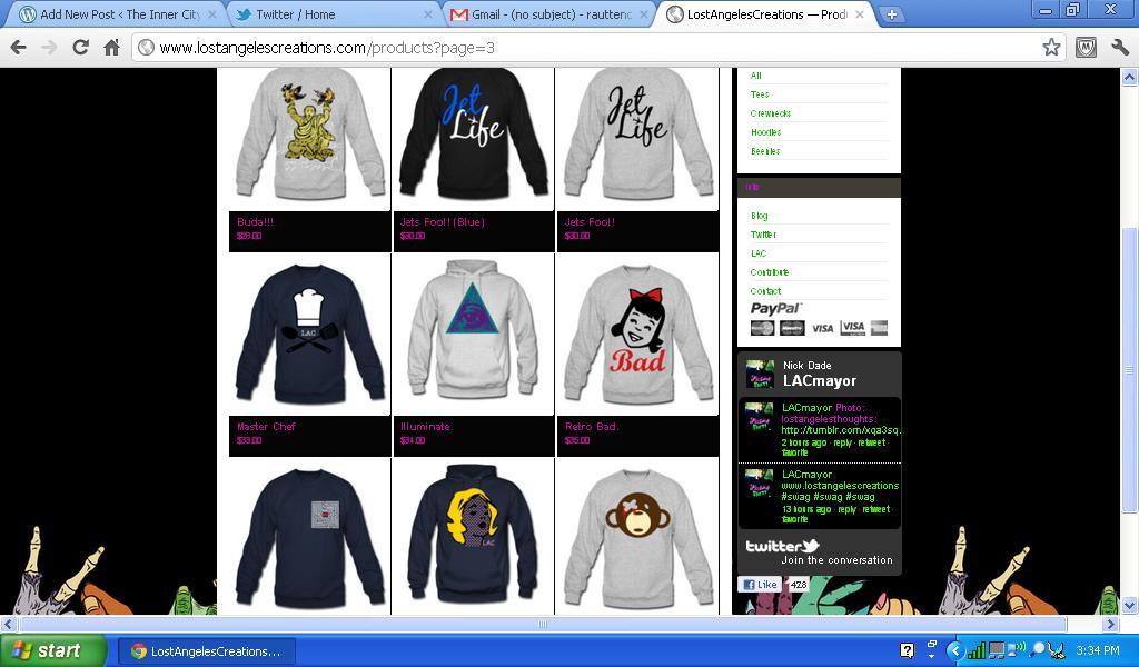 The Story…It all started back in 2008. I was just a kid trying to find my style, and trying to keep up with others so called “swag”. It took a while but then I realized I wasn’t like everyone else. Eventually, I picked up my own swag and started to get a better feel for myself. Soon after I had decided to make clothing for myself. The thought of no one having and not being able to buy what I had anywhere was so surreal and mind blowing. At the time I called myself “DadetheJedi” (long story). I didn’t have a logo, a name for my brand, a big fan base, nothing… Just thoughts, dreams and ideas. My first creation was a crewneck titled “Rise of the Night Terror” inspired by Kid Cudi’s debut album “Man of the Moon: End of Day”. The colors were kind of risky with the neon green and hot pink. Despite that, It was my creation and mine alone. Every time I wore it I got looks from almost everybody I crossed paths with. It was a rush and very inspirational. So I started back at it, staying up late trying to perfect my craft, working like a mad man. From the late nights to early mornings I got better and better, vowing to make at least one article of clothing every night. I realized needed exposure if I was going to be successful so I made a Tumblr. Time passed and a few sales later I wasn’t really getting the recognition I deserved and I stopped making clothing and selling it. Basically, I gave up. In the year 2011 I resurfaced, feeling like it was time for a fresh start. I deleted my old Tumblr and created a new one. I started building a fan base, strategically posting items one by one. After about 4 months and about 1000 followers later I knew it was time to take it to the next level. I bought my own domain but I needed a name for my clothing and along with a logo. I thought long and hard on what I wanted my line to be called. After several misses I finally thought of the one… Thus LostAngelesCreations was born. The End/Beginning.”