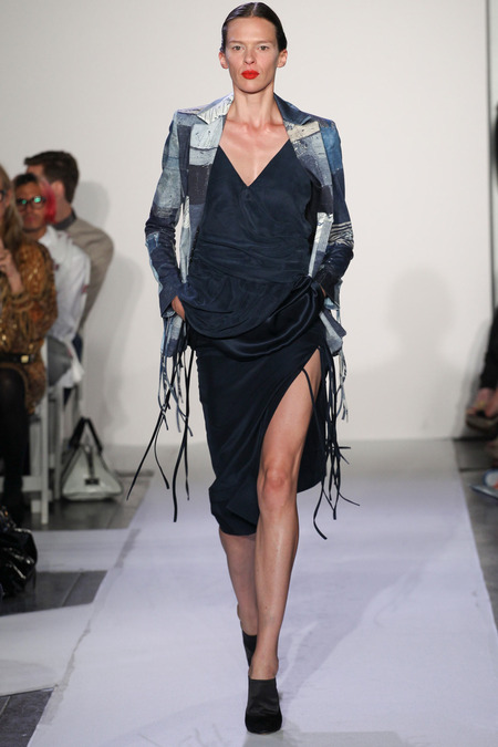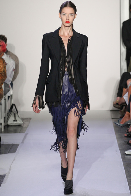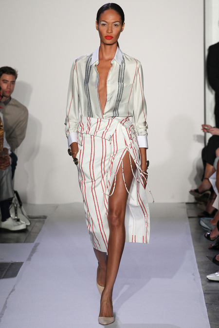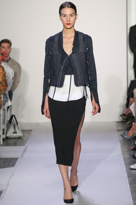 Joseph Altuzzara, (Debut 2008) Whose label has quickly stolen the attention of Kering the powerhouse behind Alexander McQueen and Stella McCartney, Has been shaking up the industry headlines with his youthful & innovative designs. Critics describe the 2014 SPRING RTW show as the most awaited in this New York season and very a testimonial to Altuzurra future success. Altuzurra parades basics on a pedestal with sleek cropped jackets, button down flowing blouses and sexy split pencil skirts. With materials such as hand embroidered Japanese Boro fabric on cropped jackets and Red & black striped silk skirts constructed of sexy fringed slits this collection creates a amazing streamlined theme of many detailed proportions.